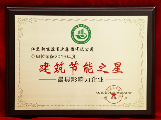 12月20日,从常州传来好消息,江苏省建筑节能协会授予江苏新能源置业集团有限公司2016年度江苏省建筑节能之星;称号,被评为最具影响力企业。此次由江苏省建筑节能协会进行的江苏建筑节能之星;评比活动,旨在提高整个建筑行业的节能意识,进一步推广建筑高效节能技术,表彰建筑节能行业示范工程,宣传建筑节能行业的先进经验,对大力实施节能减排措施,...
