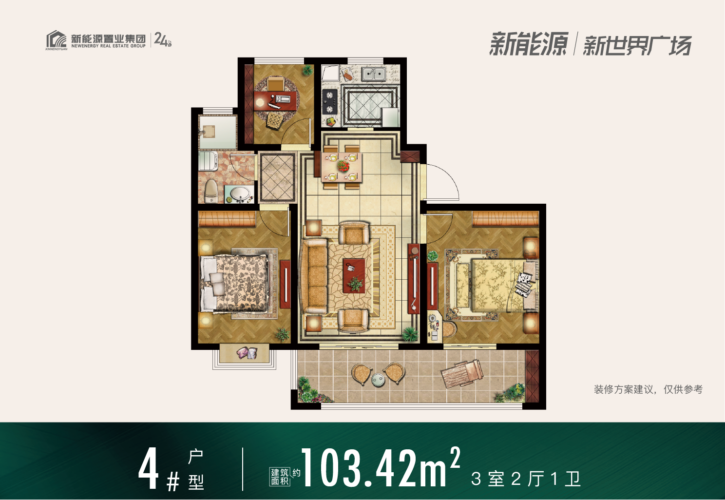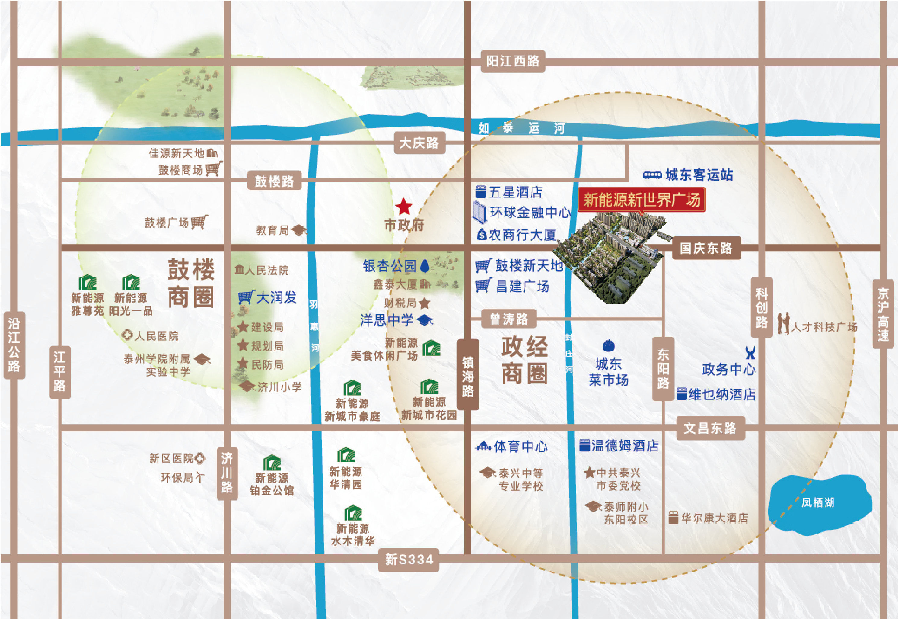 新能源·新世界广场位于国庆东路与镇海中路交汇处,是泰兴唯一一个125万方集五大核心优势于一身的的万户精英社区。项目周边配套醇熟,市政府、大润发、环球金融中心、五星级酒店、体育馆以及洋思中学等名校环绕,自带19万方的“公园式商业”昌建广场,与泰兴鼓楼购物中心合作打造鼓楼新天地,筑就城市新中心。
