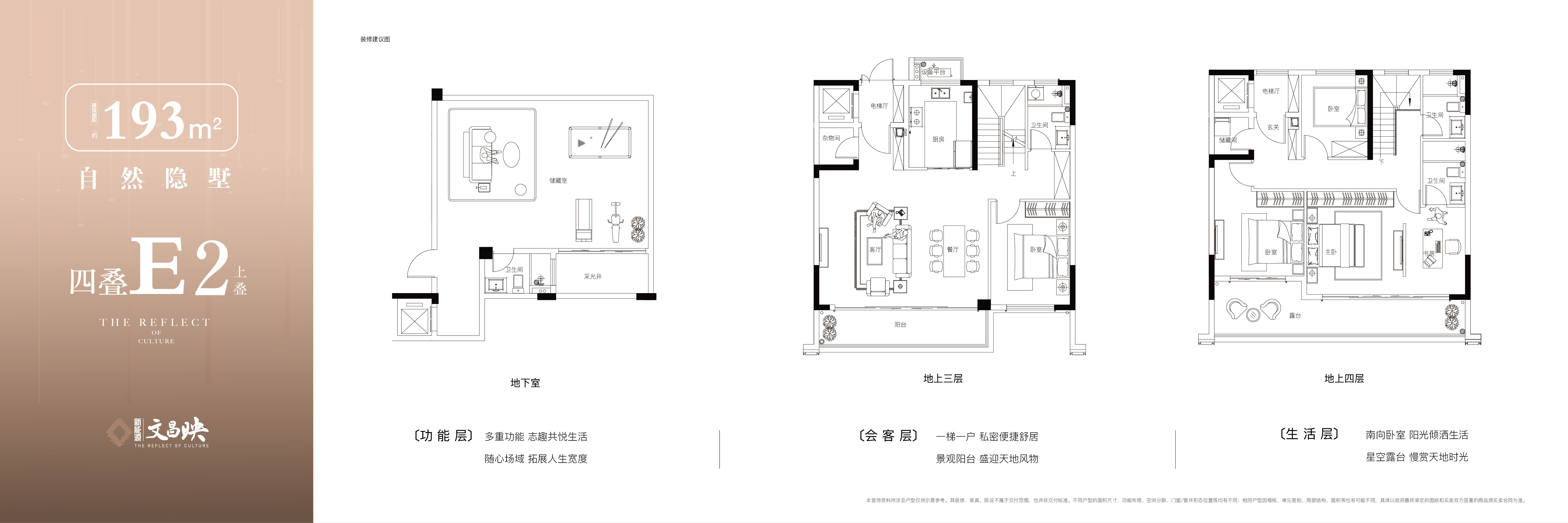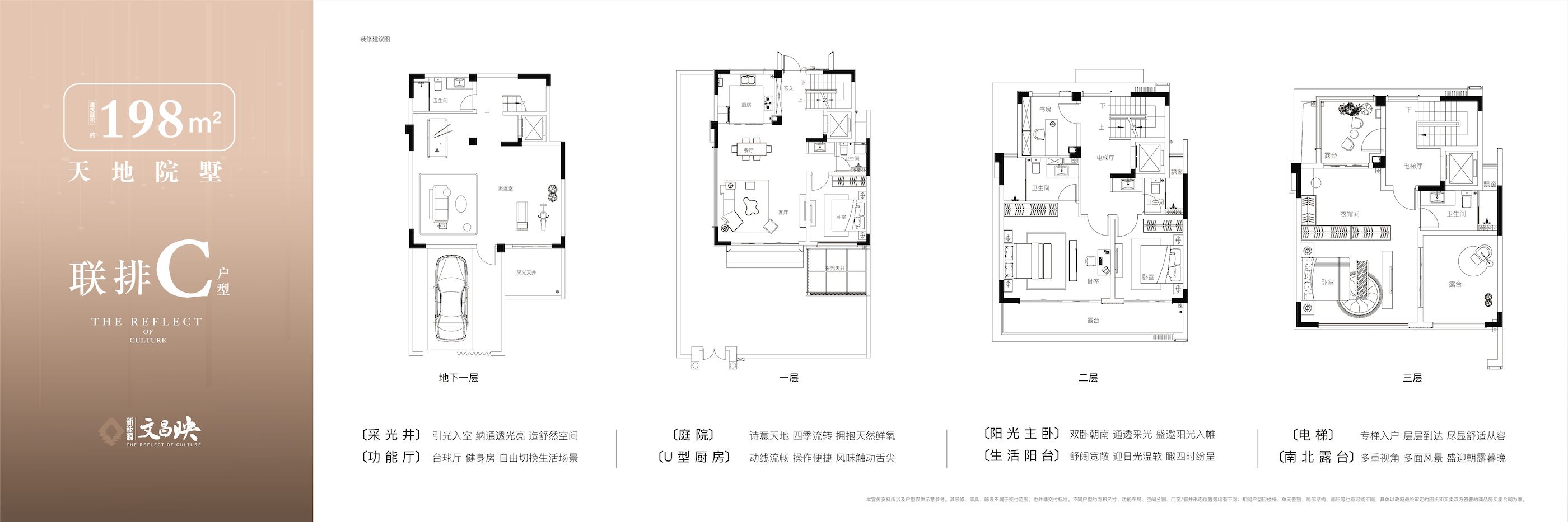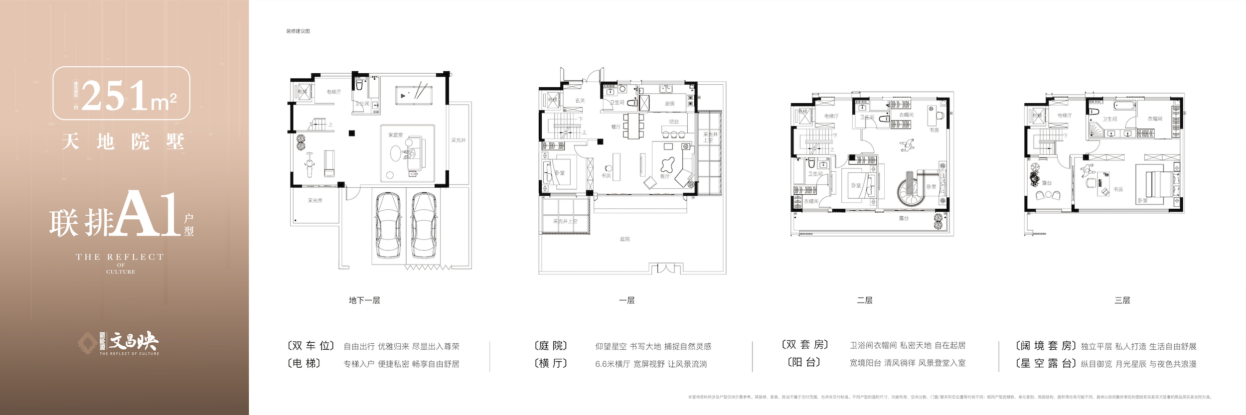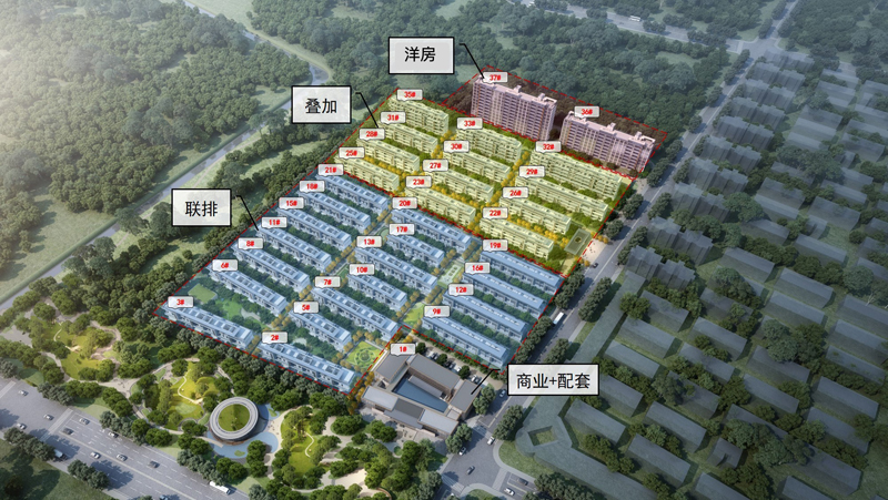 产品类型主要有联排别墅(建面约198-251㎡)、4叠&6叠别墅(建面约185-201㎡)和2栋洋房(建面约102-124㎡),低层业态配有私家庭院,公共空间布置活力组团花园。