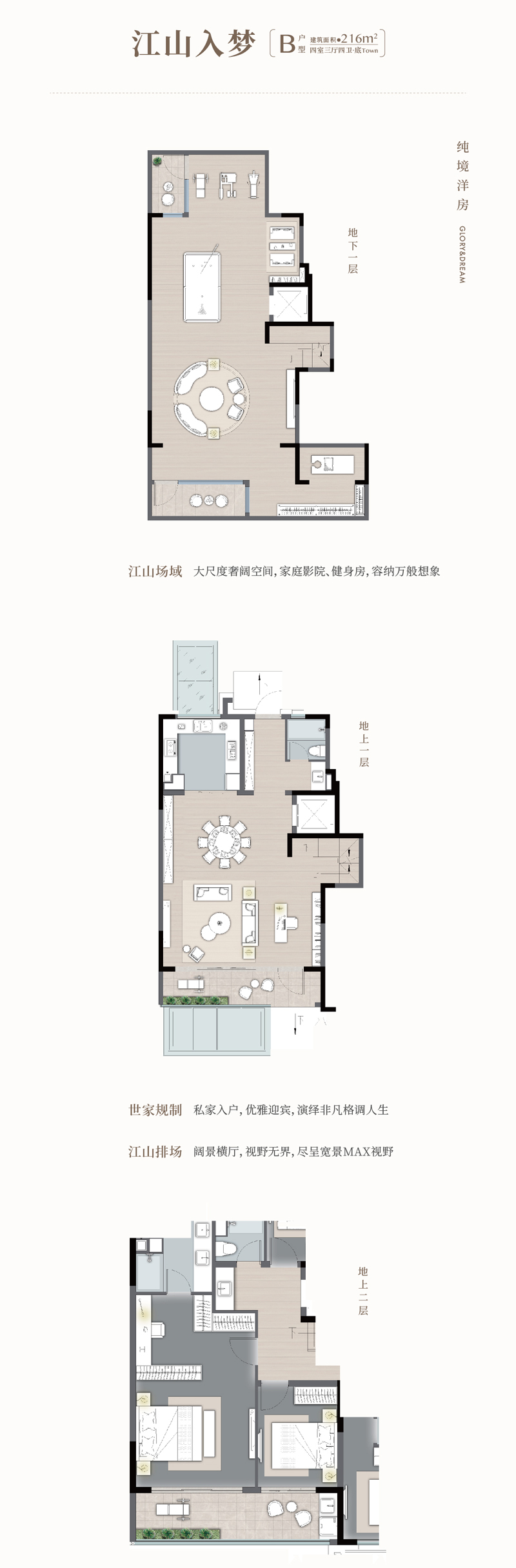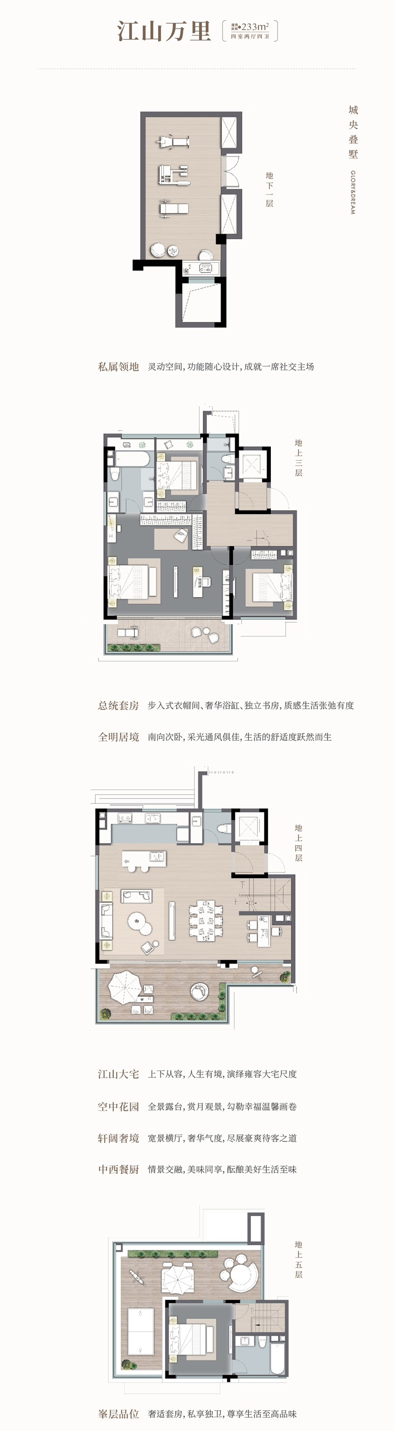 项目以「1.5低容积率」低密大境,规划洋房(建面约109-216㎡)、叠加别墅(建面约213-233㎡)两类产品,墅造全新居住境界,低层业态配有私家庭院,公共空间以江山画境为魂,打造沉稳浑厚、磅礴大气的儒门礼序,构建人景融合、居游一体的 “江山十境”规制,创造一个诗意居住、人文共荣、生活机能与精神栖居完美相融的东方意境。