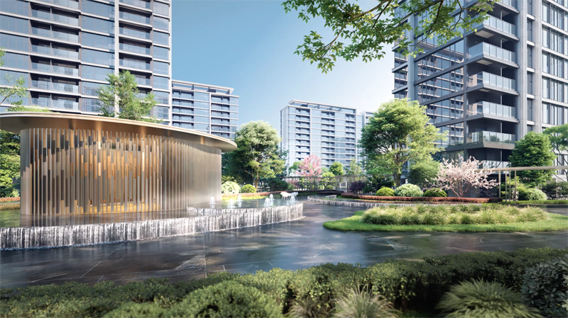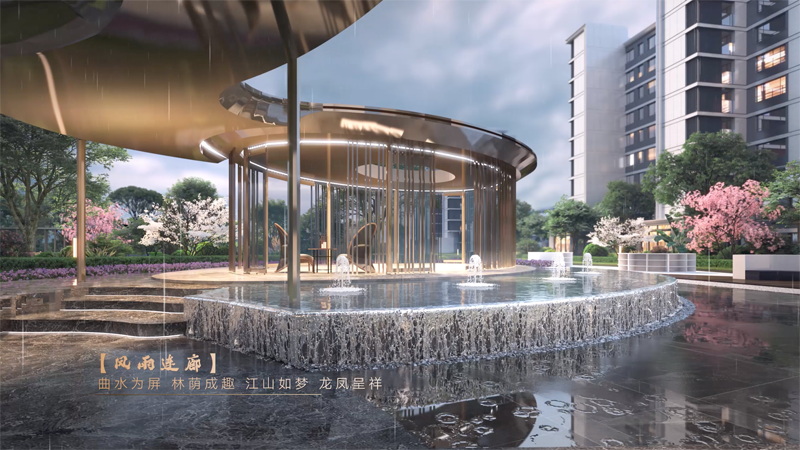 迎宾水景配以喷泉景观以装饰,将镜面水景加以艺术表达,形成龙凤呈祥之势,门庭若水定财源不绝,整体大气、恢弘,具有仪式感。