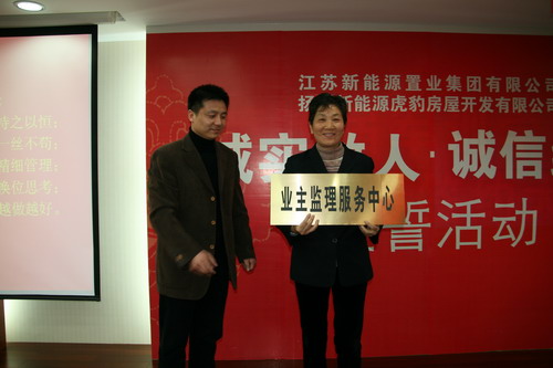 3月13日晚,江苏新能源置业集团有限公司和扬州新能源虎豹房屋开发有限公司在3.15来临之际,在公元国际大厦会议室隆重举行了诚实做人、诚信经营;宣誓活动。新能源营销部、工程部及物管公司人员和扬州各界媒体以及众多新能源项目的新老业主也应约参加了此次活动,30余位业主现场接受了新能源业主兼职工程质量 监理员。新能源营销部、物管公司及工程部也现场宣誓: