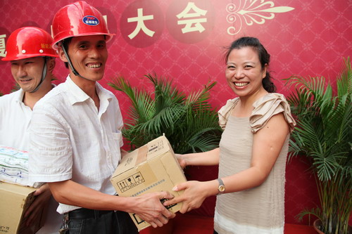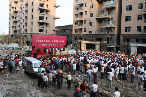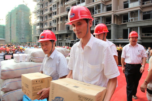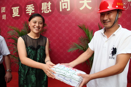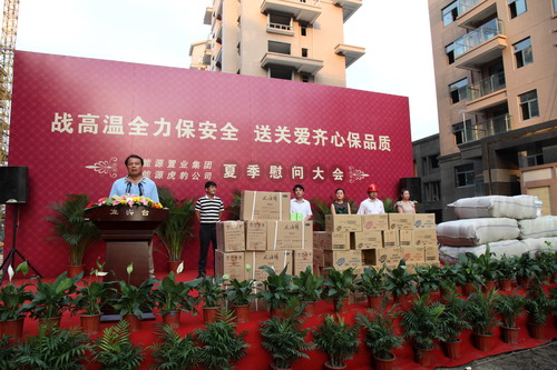 8月7日下午,阳光美第工地上锣鼓喧天,彩旗飘扬,新能源公司在这里隆重举行了夏季慰问大会。新能源集团董事长包广林、新能源虎豹公司顾载兵等公司领导出席了慰问大会。 今年高温天气迟迟不退,对于奋斗在一线的工人,公司领导看在眼里、记在心中,花了近万元为建设工人购买了毛巾、香皂等防暑用品。
