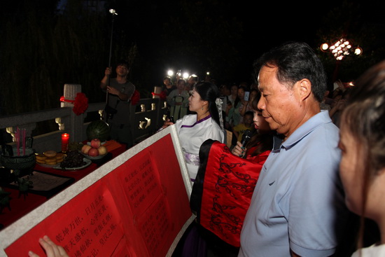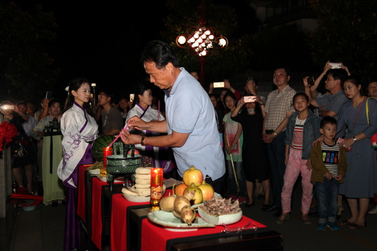 晚宴结束之后,在舒缓优雅的乐曲声中,拜月仪式正式开始。主拜江苏新能源置业集团董事长包广林点燃三炷香,向月神鞠躬、上香,6名嫦娥;分列左右,广大业主在主拜的引导下纷纷向月神祈愿,共同为美好明天和幸福生活祈福,一场古老的拜月仪式;完美上演。