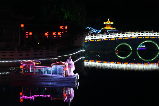 中秋节的豪第坊.扬州院子一片欢声笑语,装饰一新的各种彩灯为节日的夜晚增添了喜庆的气氛,大红的中国结分布在树上、桥梁、路旁,祝愿新能源业主的生活红红火火。