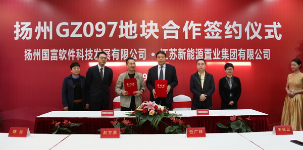 3月15日上午,江苏新能源置业集团有限公司与扬州国富软件科技发展有限公司举行GZ097项目签约仪式,新能源置业集团董事长包广林、总裁王秋云,国富科技董事长赵方勇、总监陈龙等出席。
