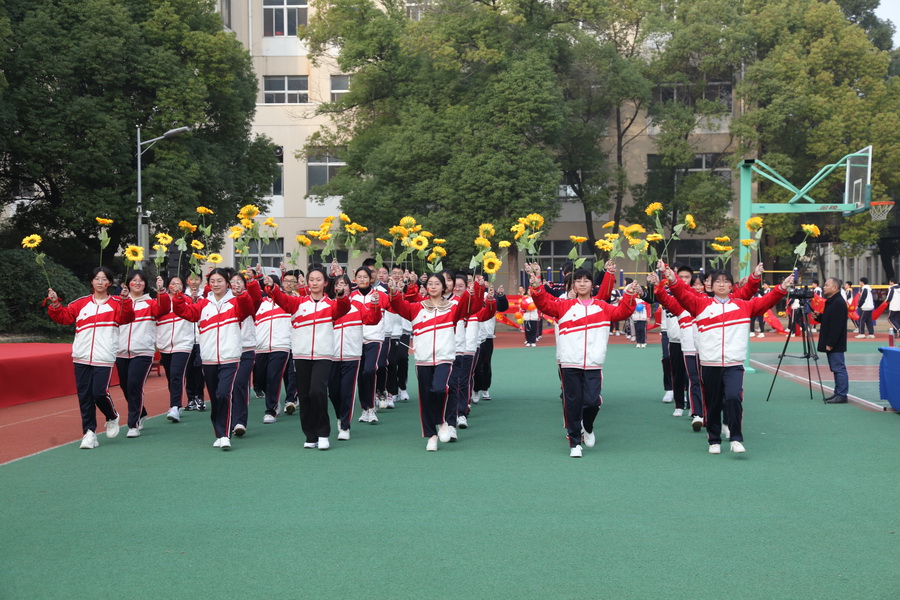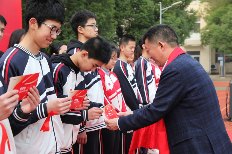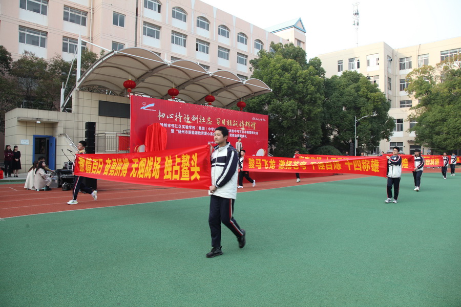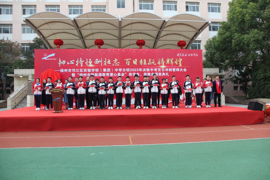 上午 7 时 50 分,邗江区实验学校九年级学生齐聚青春广场,参加 2023 年“ 决胜中考,百日冲刺 ”誓师大会暨“新能源教育爱心基金”奖学金、奖教金颁发仪式。活动在《明天会更好》《怒放的生命》乐曲中拉开序幕,校领导宣读表彰决定,王秋云为优秀学生代表和优秀教师代表颁发奖学金、奖教金,杰出校友为同学们作励志发言,同学们宣誓:“ 百日短暂,绝不彷徨。坚定目标,立足课堂。夯实基础,避短扬长。如火六月,决战沙场。日月可鉴,誓创辉煌……”