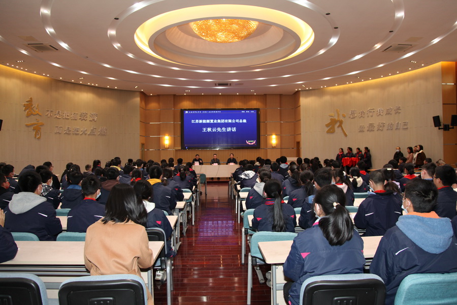 江苏新能源置业集团总裁王秋云参加了三个学校的教育爱心基金颁奖仪式,并发表讲话,他说:“ 新能源”成立 27 年来,一直关注教育事业,设立教育爱心基金,就是表达一个具有责任感企业的社会担当。希望同学们奋力冲刺中考、高考,不负青春年华。