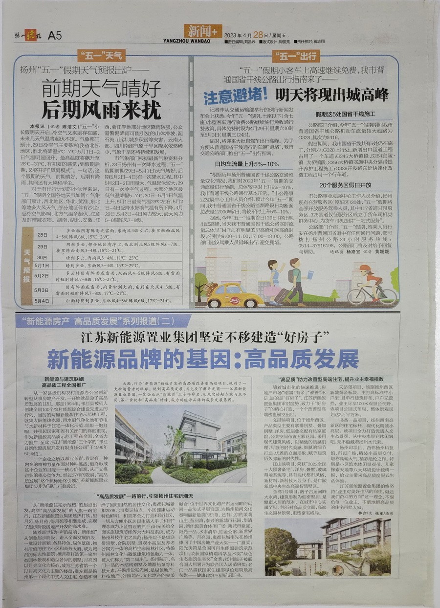 从一家县级机构农村能源办公室创新转型从事房地产开发,一开始就品尝了高品质发展的甘甜。那是1994年,邗江县被列入创建全国100个农村能源综合建设先进县的行列,当时的两幢新能源住宅示范楼工程,就集太阳能热水器、污水沼气净化池和节电节水新材料于住宅一体化示范,结果一炮打响,并引起国家和省有关部门的高度重视,作为新能源高品质示范工程在全国、全省大力推广,至此,冠以“新能源”三个字的“邗江县新能源房屋开发有限责任公司”于1996年5月诞生。